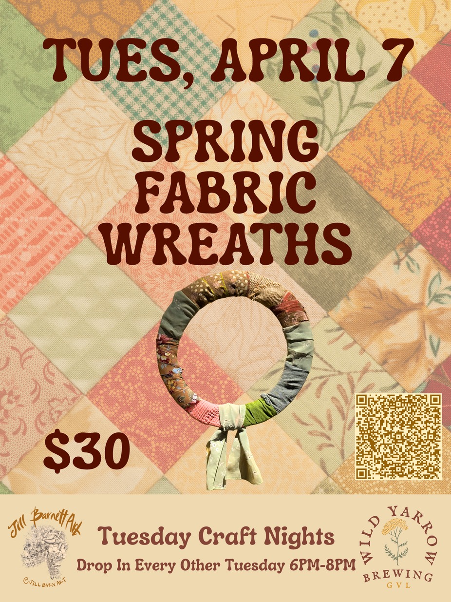 Tuesday Craft Night with Jill is back on April 7th, and we are getting our doors ready for the season. 🌿 The Recycled Fabric Spring Wreath Workshop 🌿 Stop in anytime from 6 PM – 8 PM as Jill guides you through creating a beautiful, sustainable spring wreath using recycled fabrics. Whether you’re a crafting pro or a total beginner, Jill makes it easy to create something truly special for your home. These nights have continued to grow and become such a special part of our brewery community. All are welcome! Bring a friend (or come solo and meet new ones!)